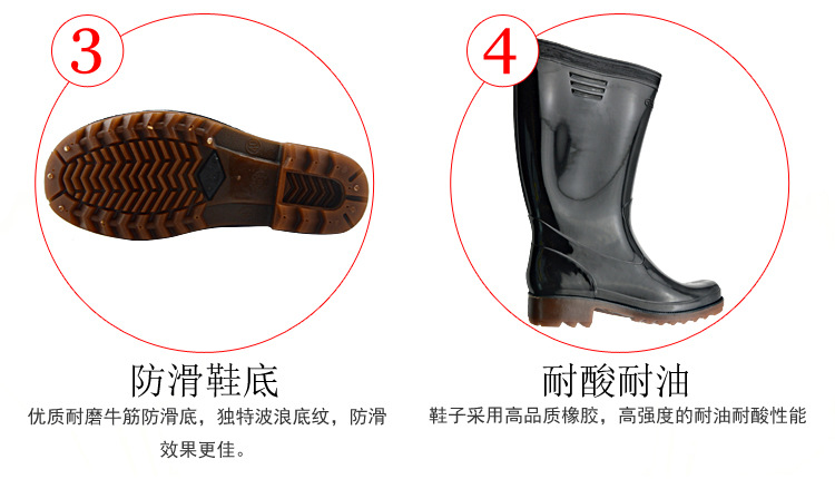 華特南峰060高筒安全靴根據(jù)人體工程學(xué)原理,更好的修飾腳部線條;精選優(yōu)質(zhì)橡膠,柔韌性特別強(qiáng),防水耐磨,穿著舒適。加厚鞋跟,比一般的鞋子更厚實(shí),耐磨。優(yōu)質(zhì)耐磨牛筋防滑底,獨(dú)特波浪底紋,防滑效果更佳。